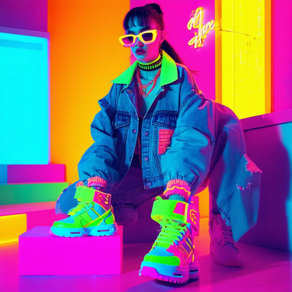 Królujące kolory to jasne neony: różowy, zielony, pomarańczowy, często łączone z wzorami jak kratka czy printy zwierzęce. Popularne materiały obejmowały bawełnę, dżins i tworzywa sztuczne, tworząc modę „grunge” lub „hip-hop”.
